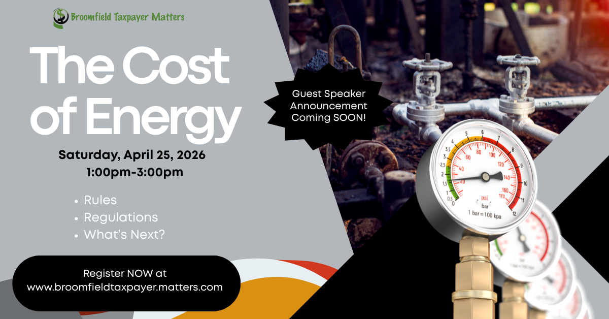 Broomfield Taxpayer’s Mission is to raise the awareness of Broomfield taxpayers of by arming them with information regarding the policies of the City and County of Broomfield that impact us civically and financially.
