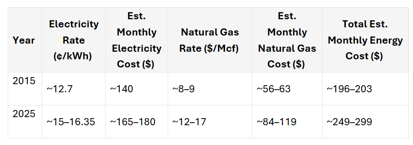 Efficiency improvements have slightly reduced average consumption per square foot, but rising rates have increased monthly bills by 25–50% since 2015.